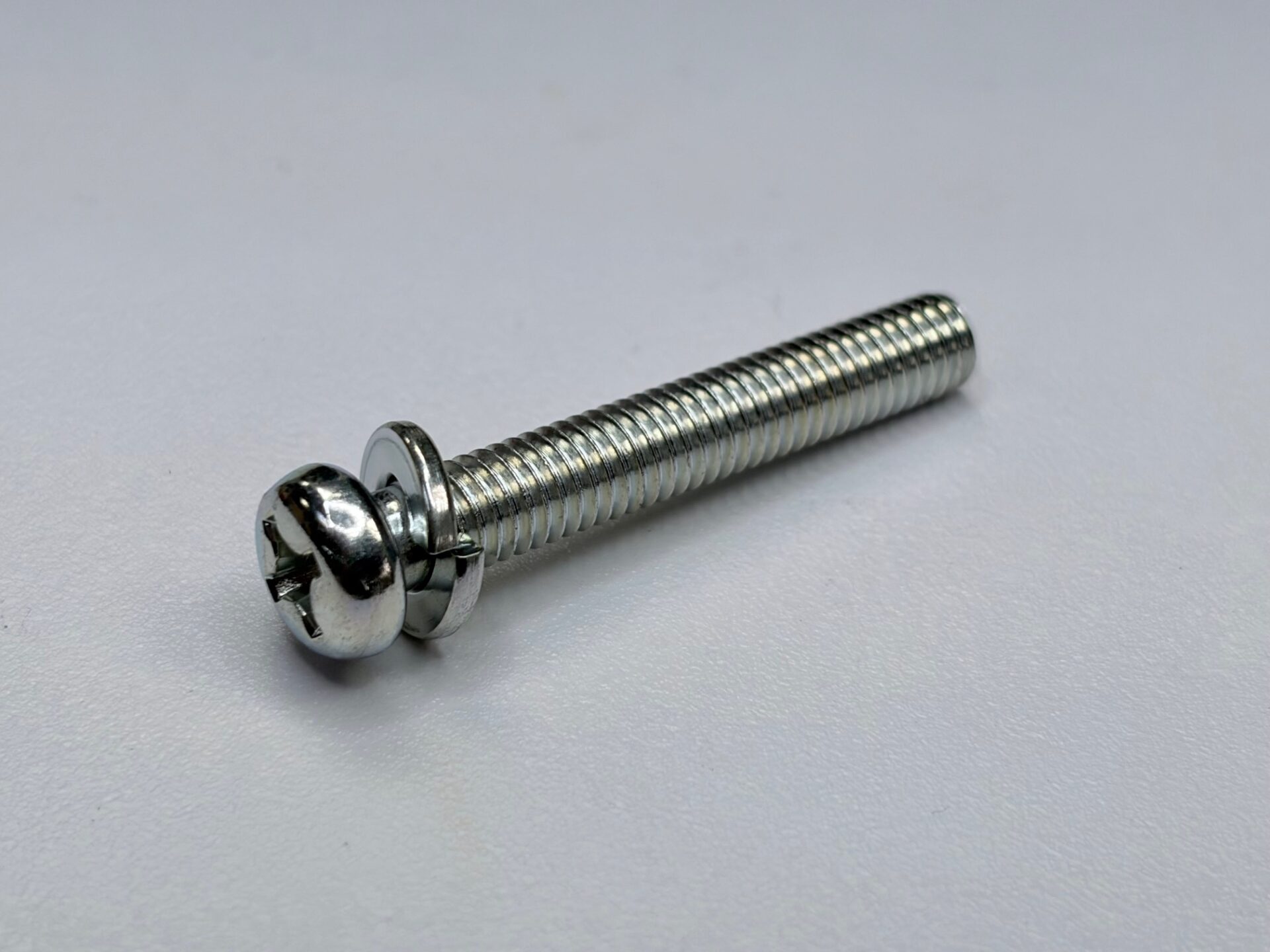 Đây là loại vít đầu nồi có rãnh chữ thập, được lắp sẵn vòng đệm vênh (spring washer) từ trước.